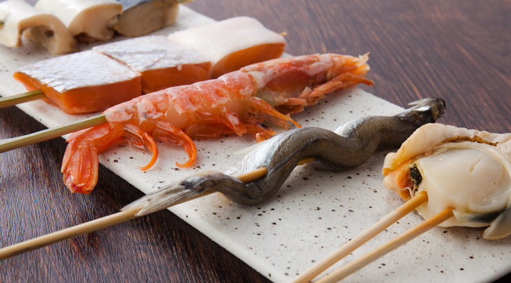 卓上の焼き台を使った“浜焼”の人気メニューをピックアップ。ホタテ2個と赤海老2本・イカの丸焼と、バランス良く楽しめるため、初めての方にもオススメです。